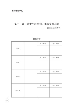 生涯规划导航 第十三课 高中生涯规划,未来发展愿景 ——我的生涯规划书 自我分析 高二调整 高三调整 兴趣 高二调整 高三调整 能力 高二调整 高三调整 性格 高二调整 高三调整 价值观 214