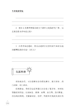 生涯规划导航 2.是什么支撑着樊锦诗致力于敦煌文化保护的工作,而 且将其作为毕生的工作? 3.在高考填志愿时,你是会选择自己喜欢的专业还是选 择薪酬较高的专业?为什么? 生涯科普 职业的分类:可以将职业分为传统职业、新兴职业、热 门职业、冷门职业。 传统职业,指在职业世界里已经存在了很多年,相对比 较稳定的职业。比如医生、教师、厨师、农民等。新兴职业, 指出现比较晚,是随着政治、经济、科技和文化的发展以及 136