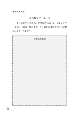 生涯规划导航 活动体验三:生涯图 请用彩笔在 A4 纸上画下你当前的生涯困扰,如果暂时没 有困扰,可以画下你期望的一生。画好后可以和你的同学相 互分享你们的生涯图。 我的生涯困扰 12