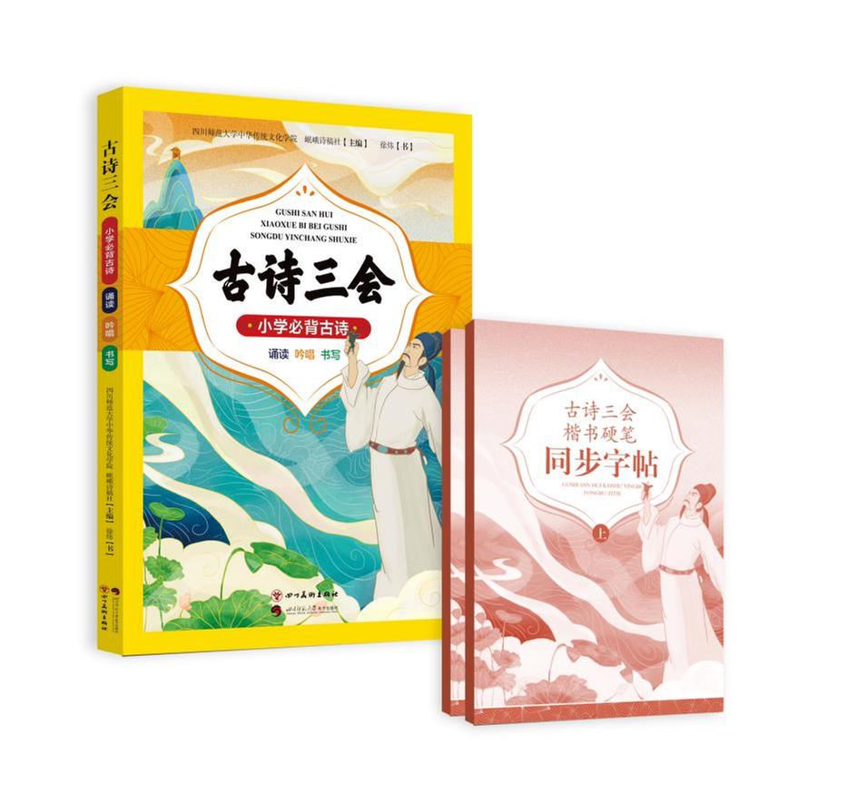 《古诗三会 小学必背古诗词》由四川师范大学中华传统学院、岷峨诗稿社主编,著名书法家徐炜老师为本书题写书名并提供书法作品,四川美术出版社与四川师范大学电子出版社联合出版。内容共囊括了小学阶段所需的75首必背古诗,同时配备译文及赏析部分内容。并提供诵读或者吟唱相关音频,同时配套两本硬笔楷书同步字帖。为同学们提供一个集诵读、吟唱及书写古诗的模板。