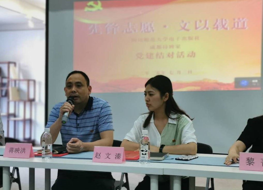 在座谈会上,电子出版社党支部书记蒋映洪同志就我社党支部情况作了介绍,并与华西企业文化有限公司(诗婢家)党支部同志探讨了开展党支部结对共建活动的意义与思路。双方一致认为,开展支部共建活动是以党建工作推动出版业务工作以及与“诗婢家”进行深度文化交流的一项重要措施,也是促进双方党员学习与交流中华传统文化的有效载体。此次支部共建活动既增加了相互了解,加强了相互交流,也增进了彼此友谊,是将党建与业务深度融合的又一次新尝试和有益探索,双方将以此次共建活动为契机,进一步加强学习交流,通过支部共建达到资源共享、优势互补,充分发挥双方优势,把“四川师大电子出版社”“诗婢家”的品牌做得更好。
