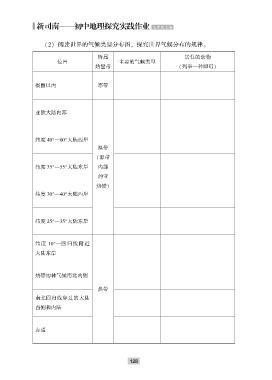 (2) 阅读世界的气候类型分布图ꎬ 探究世界气候分布的规律ꎮ 所属 居住的动物 位置 主要的气候类型 热量带 (列举一种即可) 极圈以内 寒带 亚欧大陆内部 纬度 40°—60°大陆西岸 温带 (温带 纬度 35°—55°大陆东岸 内部 的亚 热带) 纬度 30°—40°大陆西岸 纬度 25°—35°大陆东岸 纬度 10°—回归线附近 大陆东岸 热带雨林气候南北两侧 热带 南北回归线穿过的大陆 西侧和内陆 赤道 1 2 8