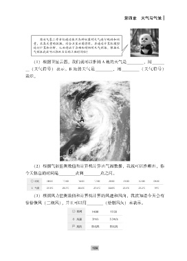 第四章 天气与气候 (1) 根据卫星云图ꎬ 我们就可以推测 A 地的天气是 ꎬ 用 (天气符号) 表示ꎮ B 地的天气是 ꎬ 用 ( 天气符号) 表示ꎮ (2) 根据气温监测数值和计算机计算出气温数据ꎬ 我就可以推断出ꎬ 你 今天休息的时间是 点到 点之间ꎮ (3) 根据风力监测数值和计算机计算的风速和风向ꎬ 我就知道今天会有 徐徐微风 (二级风)ꎬ 并且可以用 (绘制风矢) 来表示ꎮ 1 0 9