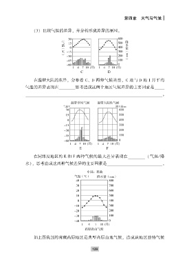 第四章 天气与气候 (3) 比较气候的差异ꎬ 并分析形成差异的原因ꎮ 在温带大陆的东岸ꎬ 分布着 C、 D 两种气候类型ꎬ C 地与 D 地 1 月平均 气温的差异表现在 思考造成这两个地区气候差异的主要因素是 ꎮ 在同纬度地区的 E 和 F 两种气候的最大差异表现在 (气温/ 降 水)ꎬ 思考造成这两种气候差异的主要因素是 ꎮ 如上图我国的青藏高原地区是典型高原山地气候ꎬ 造成该地区独特气候 1 2 9