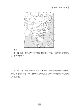 第四章 天气与气候 思考: 1. 根据地图ꎬ 你知道中华秋沙鸭的繁殖地位于什么气候区吗? 越冬地又 位于什么气候区呢? 2. 目前全球正面临这全球变暖这一气候变化ꎬ 而中华秋沙鸭对环境极其 敏感ꎬ 被称为环境指示种ꎮ 请你推测全球变暖会让中华秋沙鸭的迁徙行为发 生什么变化? 1 3 1