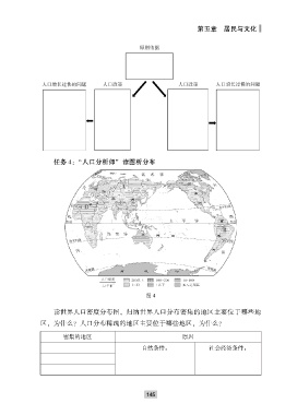 第五章 居民与文化 任务 4: “人口分析师” 读图析分布 图 4 读世界人口密度分布图ꎬ 归纳世界人口分布密集的地区主要位于哪些地 区ꎬ 为什么? 人口分布稀疏的地区主要位于哪些地区ꎬ 为什么? 密集的地区 原因 自然条件: 社会经济条件: 1 4 5