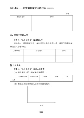续表 稀疏的地区 原因 三、 世界不同的人种 任务 5: “人口分析师” 阅读知人种 阅读教材ꎬ 根据体质特征ꎬ 找出世界人种分为哪三类? 他们的体貌特征 和成因又是什么呢? 人种名称 体貌特征 成因 行后实操 任务 6: “人口分析师” 家庭人口普查 (1) 调查家庭五代人的兄弟姐妹数量ꎮ 爷爷的爷爷 爸爸的爷爷 爷爷 爸爸 我 人数 (2) 根据上表绘制家庭兄弟姐妹数量变化图ꎮ 图 5 1 4 6