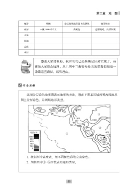 第二章 地 图 地形 海拔 分层设色地形图上的颜色 地形特点 高原 一般 1000 米以上 黄褐色 边缘陡峭ꎬ 内部和缓 山地 盆地 丘陵 平原 感谢大家的帮助ꎬ 我和司司已经准确定位到宝藏了ꎬ 再 麻烦大家结合地图ꎬ 从上图中三角符号处出发帮我们规划一 条最适宜路径ꎬ 说明理由ꎮ 行后实操 运用分层设色地形图表示地形的方法ꎬ 请在下图某区域的等高线地形 图上分层涂色ꎬ 并判断地形类型ꎮ 1. 根据图中高度表ꎬ 用不同颜色彩笔完成涂色ꎮ 2. 判断图中①-⑤所代表的地形类型ꎮ 5 5