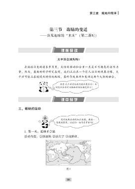 第三章 陆地和海洋 第三节 海陆的变迁 ———预见地球的 “未来” (第二课时) 太平洋会消失吗? 在地球历史的漫长岁月里ꎬ 大陆的移动和合并一直是不可避免的自然力 量ꎮ 然而ꎬ 最新的科学研究表明ꎬ 我们正站在一个引人注目的现象边缘ꎬ 太 平洋可能正在缓慢而持续地收缩ꎬ 最终导致亚洲和美洲这两个大陆的融合ꎮ 三、 板块的运动 1. 第一关: 爱拼才会赢 活动内容: ①拼板块 ②说名字 ③找特征ꎮ 图 1 9 1